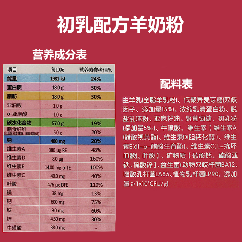 ÅäÁÏ±í£º ÉúÑòÈ飨ȫ֬ÑòÈé·Û£©¡¢µÍ¾ÛÒìÂóÑ¿ÌÇ£¨Ë«ÆçÒò×Ó£¬£¬£¬£¬£¬£¬£¬£¬Ìí¼ÓÁ¿15%£©¡¢Å¨ËõÈéÇåÂѰ׷ۡ¢ÍÑÑÎÈéÇå·Û¡¢ÑÇÂéÓÍ¡¢³õÈé·Û£¨Ìí¼ÓÁ¿5¡ë£©¡¢ÉÅʳÏËά¡¢Å£»£»£»£»£»£»ÇËᡢάÉúËØ¡¾Î¬ÉúËØA(´×ËáÊÓ»Æõ¥)¡¢Î¬ÉúËØD£¨µ¨¸Æ»¯´¼£©¡¢Î¬ÉúËØE£¨dl-¦Á-´×ËáÉúÓý·Ó£©¡¢Î¬ÉúËØC£¨L-¿¹»µÑªËá)¡¢Ò¶Ëá¡¿¡¢¿óÎïÖÊ£¨Ì¼Ëá¸Æ¡¢ÁòËáÑÇÌú¡¢ÁòËáп£©¡¢ÒæÉú¾ú£¨¶¯ÎïË«Æç¸Ë¾úBL12¡¢ÊÈËáÈé¸Ë¾úLA85¡¢Ö²ÎïÈé¸Ë¾úLP90£©Ìí¼ÓÁ¿1¡Á106CFU/g¡£¡£¡£¡£¡£¡£¡£